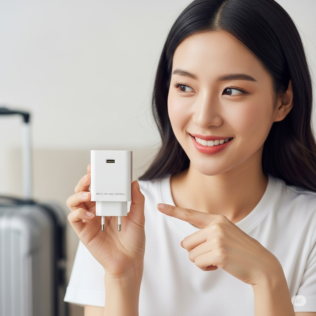 요즘 우리 여행 갈 때 챙기는 전자기기가 한두 개가 아니죠? 스마트폰, 보조배터리, 노트북... 이걸 다 충전하려면 짐이 한가득! 그래서 미소는 똑똑한 여행자답게, 이 모든 걸 한 방에 해결하는 '[최신형 멀티어댑터]' 하나만 챙겨요.