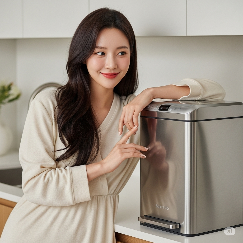- [저도 정말 여러 제품을 써봤는데, 이건 정말 '찐'이에요. 버튼 하나만 눌러주면 내부가 진공 상태가 되면서 냄새를 원천 차단해주더라고요. 스테인리스 재질이라 김치 국물이 배거나 냄새가 남을 걱정도 없고요. 이제 음식물 쓰레기통 때문에 인상 찌푸릴 일 없이, 쾌적하고 예쁜 주방을 유지할 수 있답니다!]